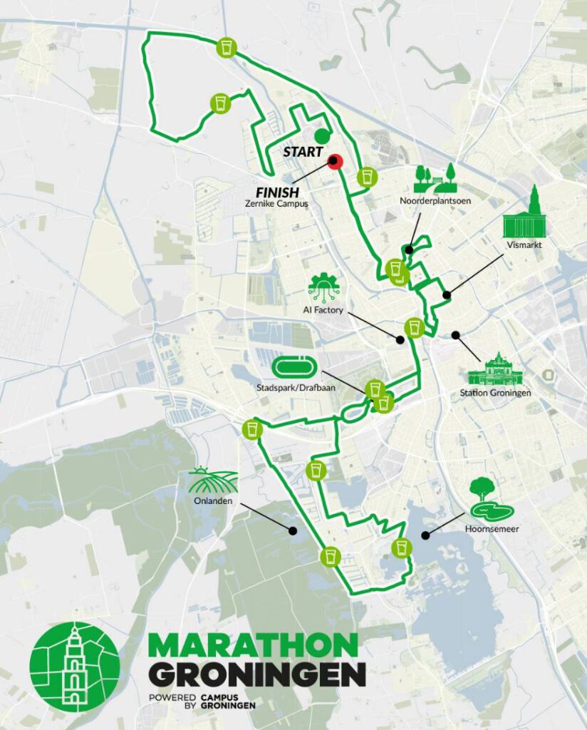 De organisatie zegt hierover het volgende: ‘Met een prachtig één ronde parcours over een van de innovatiefste campussen van Nederland, langs iconische hoogtepunten, dwars door het centrum én de noordelijke en zuidelijke buitengebieden van Groningen krijgt de stad een echte marathon.’